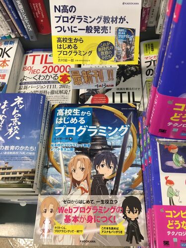 この度、N高等学校/N予備校のプログラミング入門コースで授業した内容の最初の3か月の部分が本になりました! 表紙や中の扉絵がソードアートオンラインなのは、中高生の皆さんにとりあえず興味を持ってもらえるようにそのようになっています。川原礫先生、本…